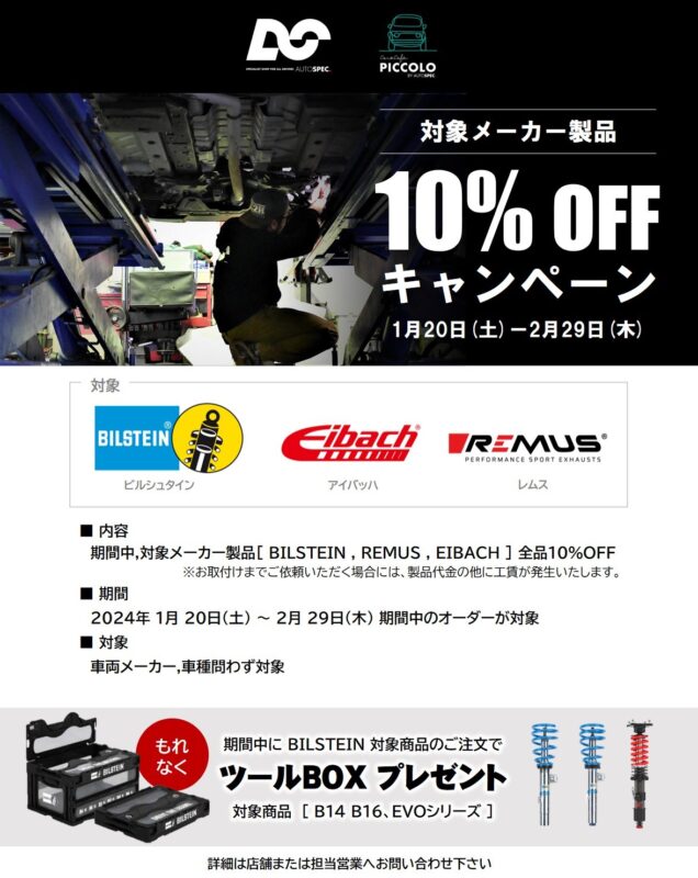 期間は明日の1月20日(土)~2月29日(木)までで、車種や金額等の縛りは御座いません!取付予定はまだ先だけど、パーツだけこのタイミングで買っておこうみたいな事もOKです。