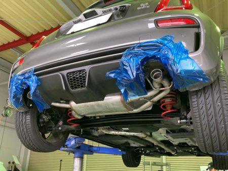 まず傷を付けないようにしっかり養生をし純正マフラーを取り外していきます。
