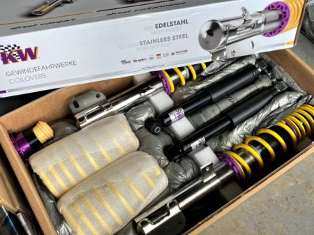 純正の車高はやや前下がり感がありましたが、KW装着で前後の車高をほぼ水平に調整しました。