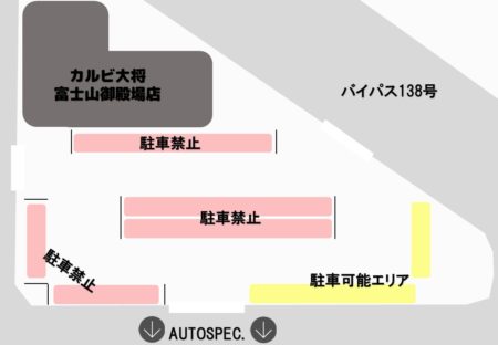 当日の駐車場はアウトスペック向かいにあります「カルビ大将富士山御殿場店」様のご厚意で、広い駐車場の一角をお借りしています。
